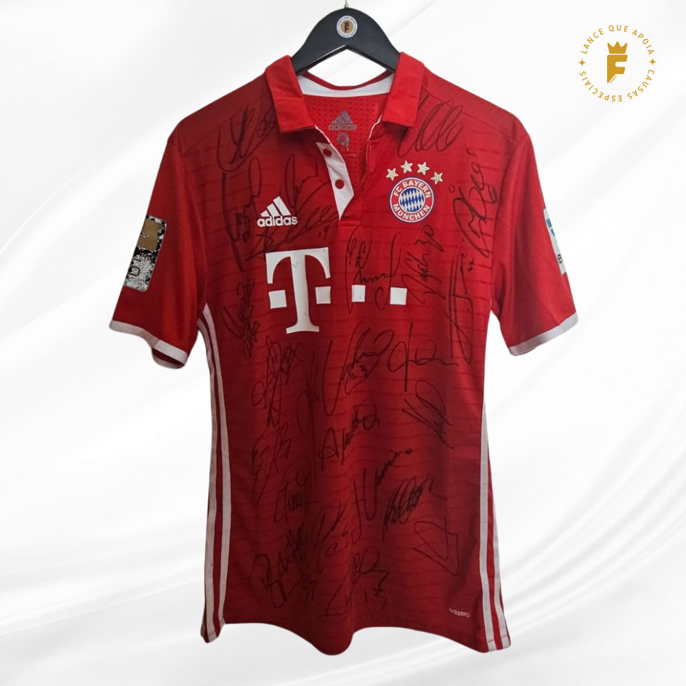 Camisa Bayern Munich 2016-17, vers jogo, autografada elenco e técnico Ancelotti campeões Bundesliga e Supercopa da Alemanha