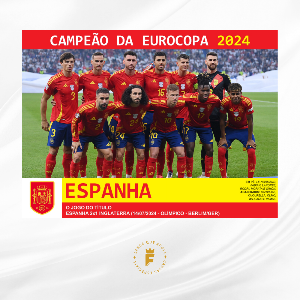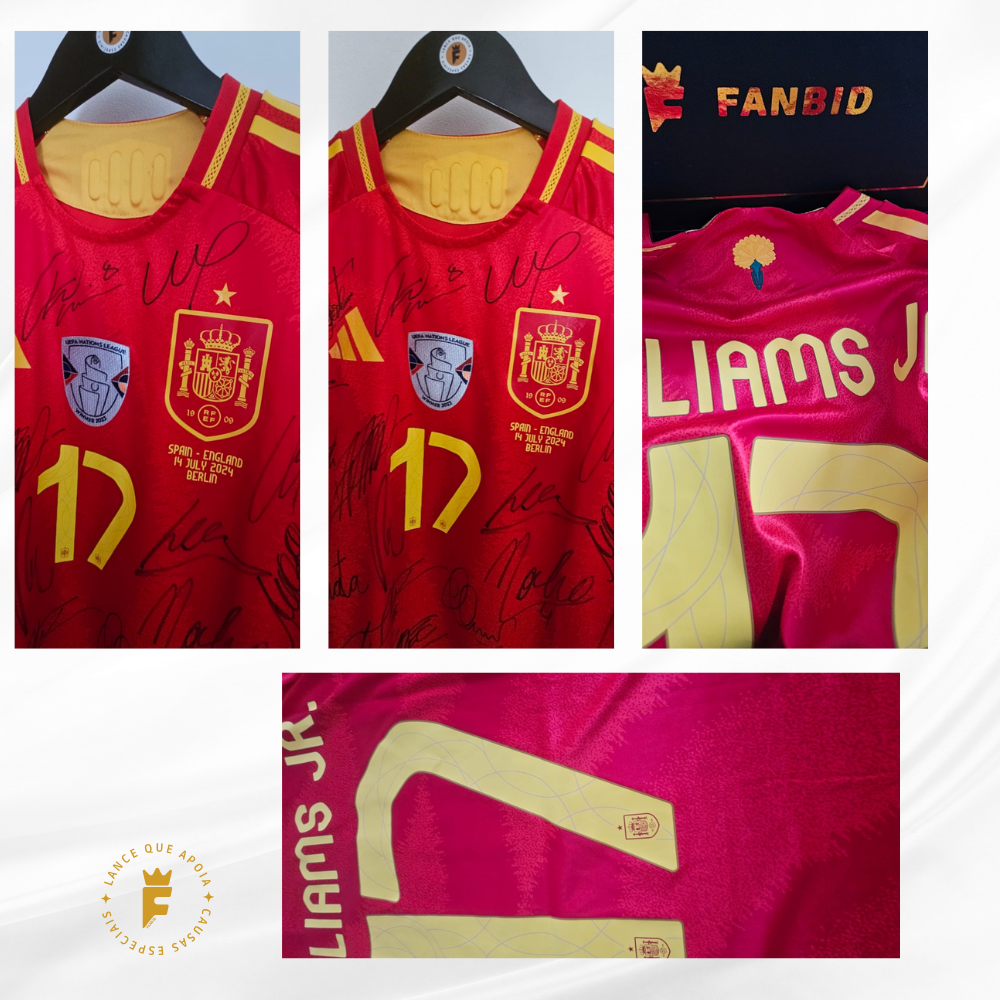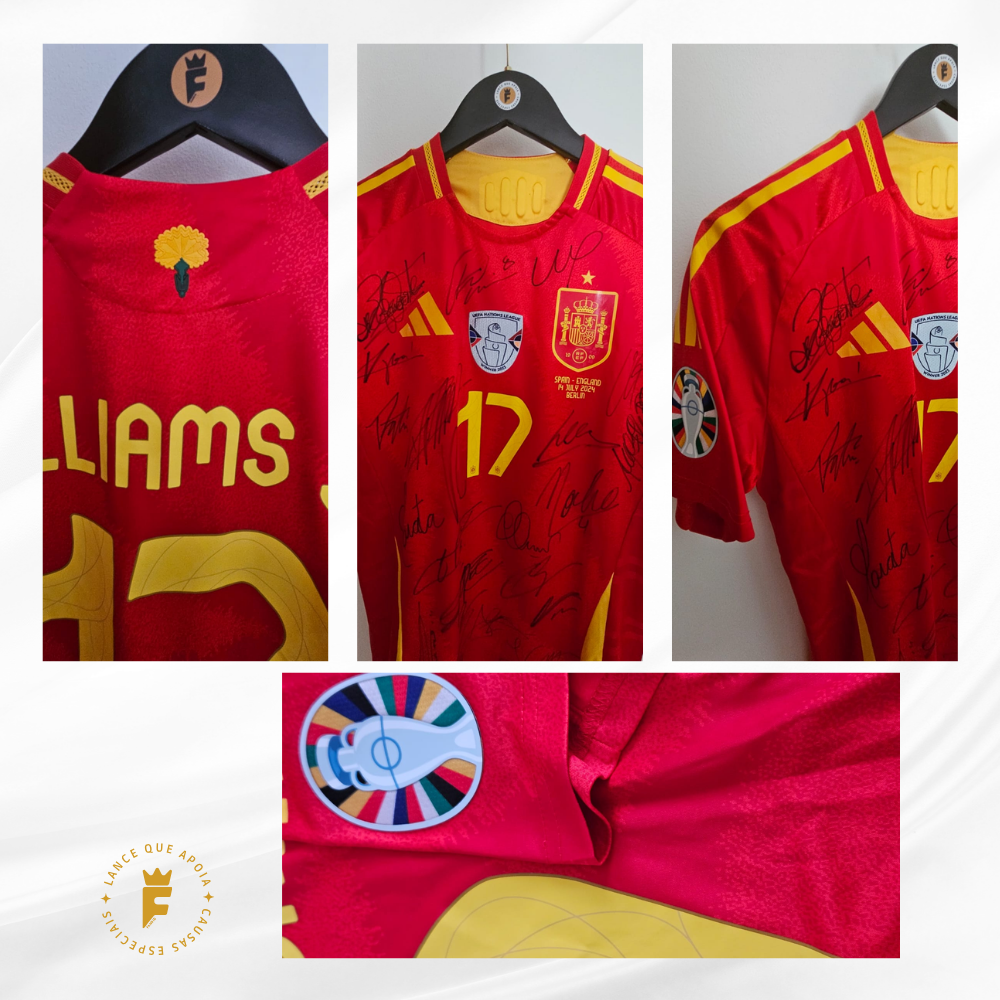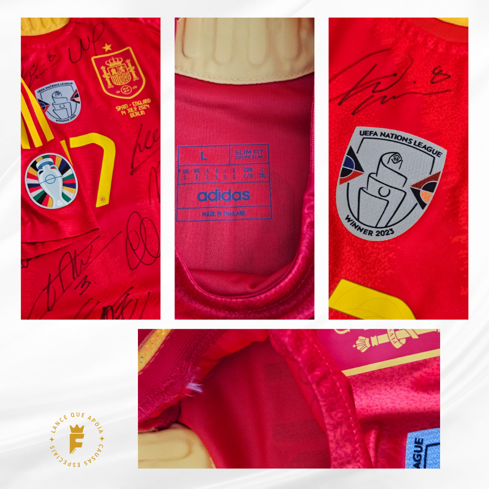 Autografada a mão elenco campeão Euro 2024 Nico Williams, Rodri, Lamine Yamal, Cucurella, Fabián Ruiz, Dani Olmo, Unai Simón, Carvajal, Le Normand, Laporte, Fabián Ruiz, Morata, Oyarzabal, Merino, Nacho, Zubimendi, Ferran Torres, Álex Baena, entre outros.