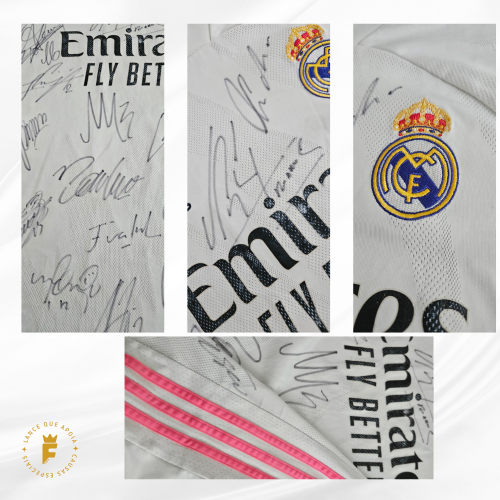 Autografada a mão por elenco Sergio Ramos, Varane, Courtois, Casemiro, Kross, Modric, Benzema, Éder Militão, Dani Carvajal, Vini Jr, Rodrygo, Federico Valverde,Nacho, Marcelo, Eden Hazard entre outros..