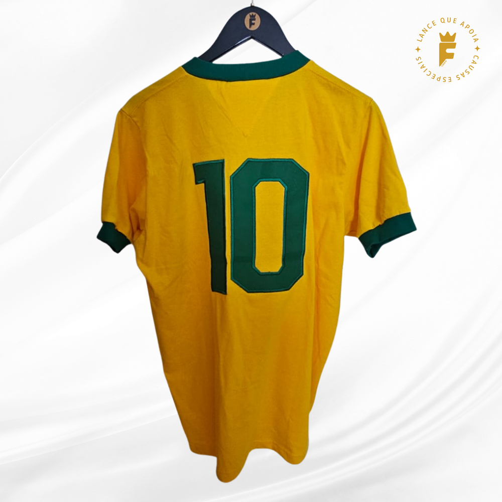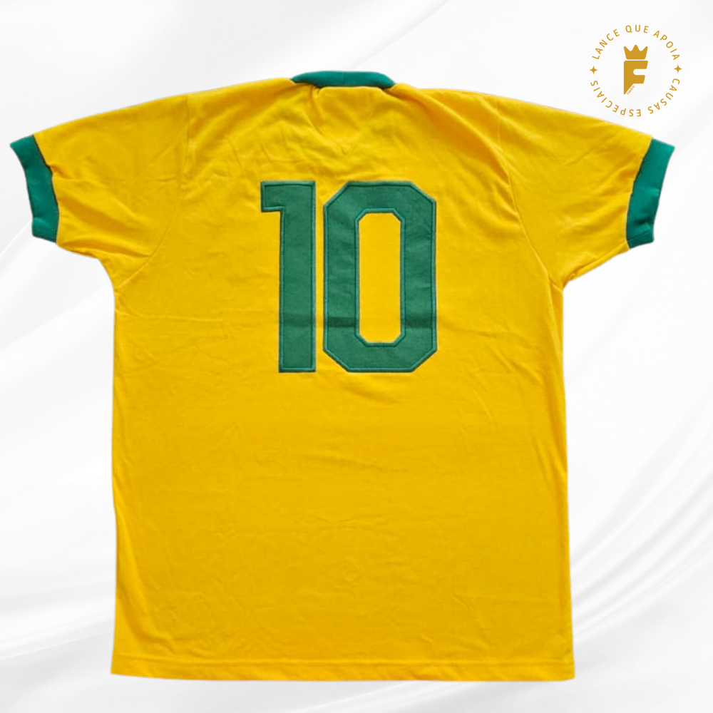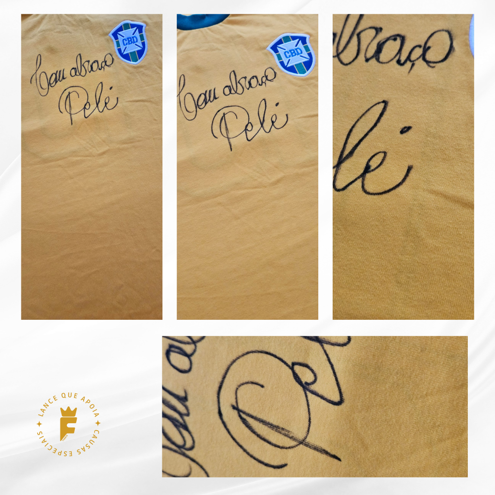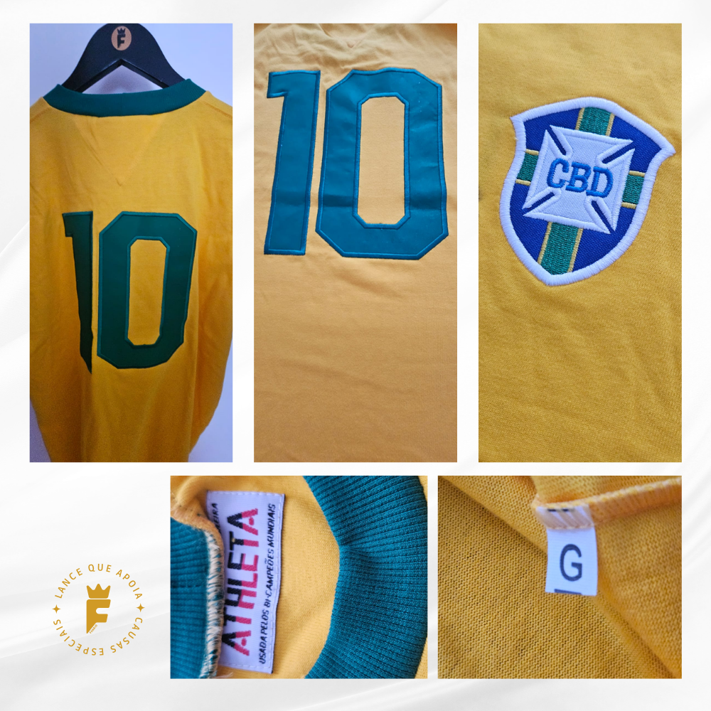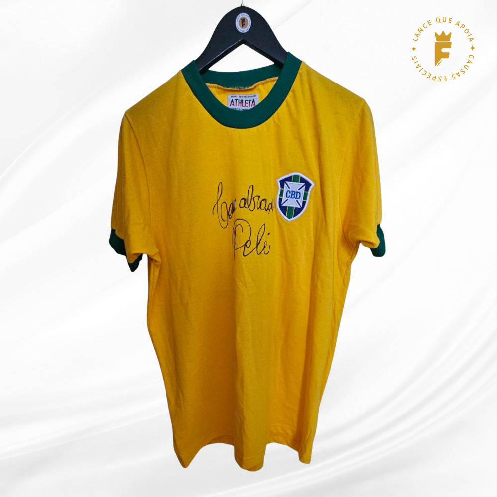 Camisa reedição do tri Seleção Brasileira Copa de 1970, amarela, licenciada Athleta autografada Pelé.