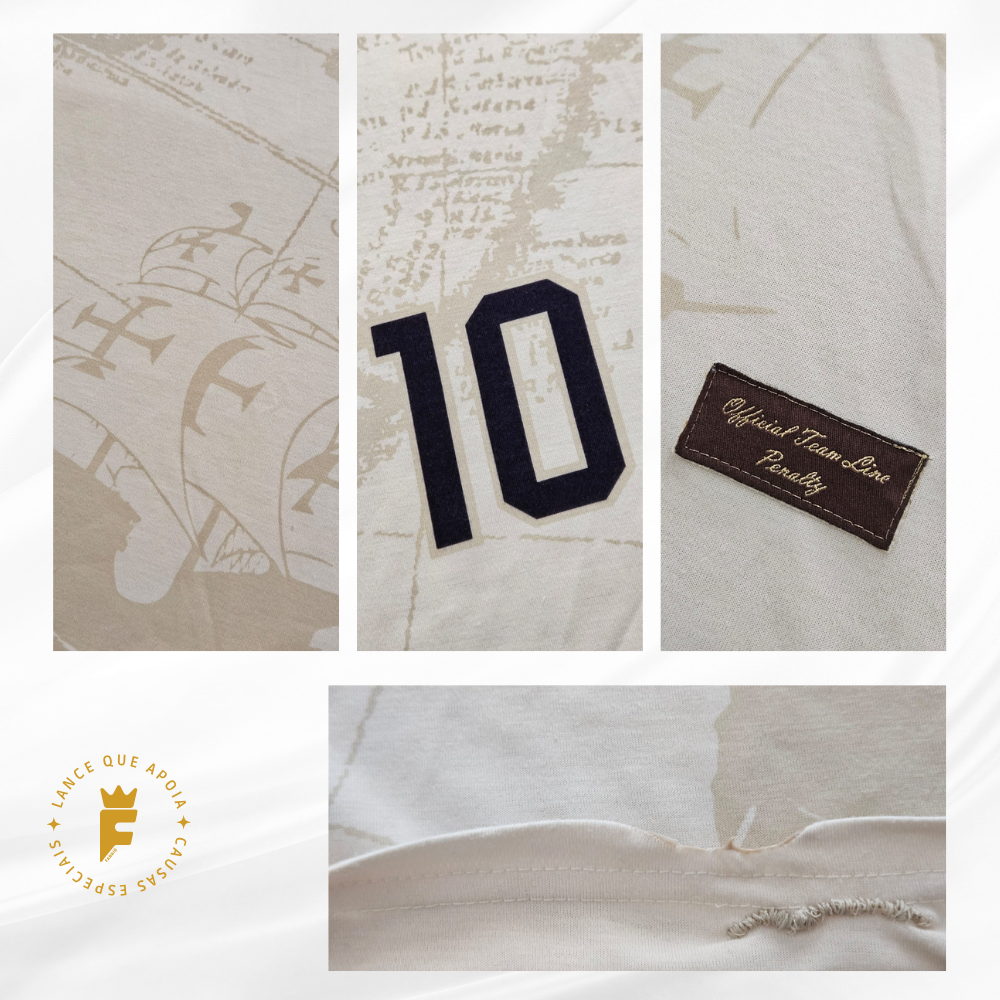 Camisa Penalty Vasco Raízes 2013 Fem bege, com manga curta e gola personalizada. Apresenta estampa temática de caravela na parte frontal, faz homenagem ao Grande Almirante Português Vasco da Gama.