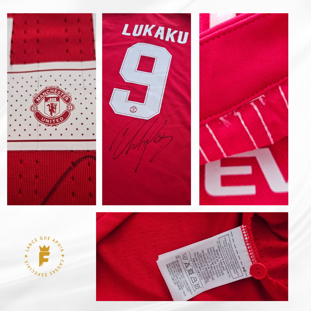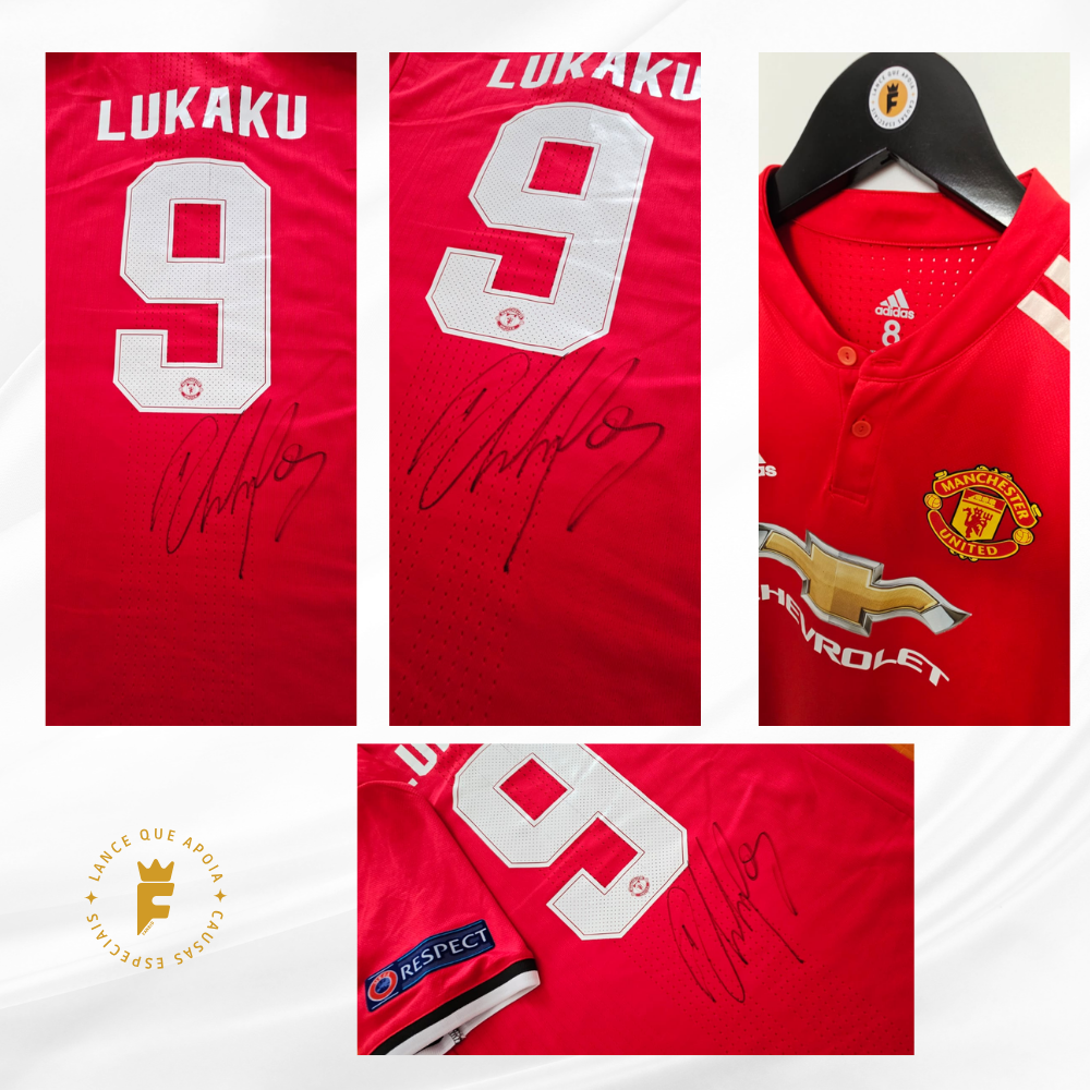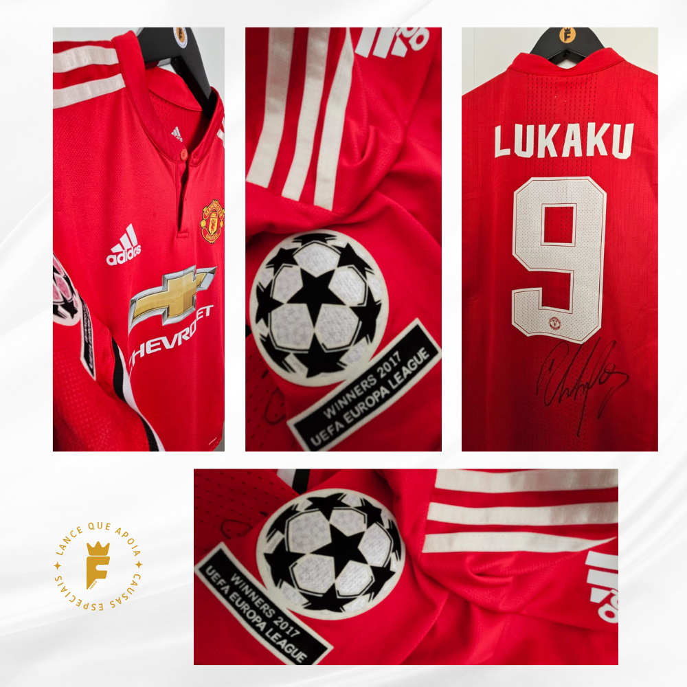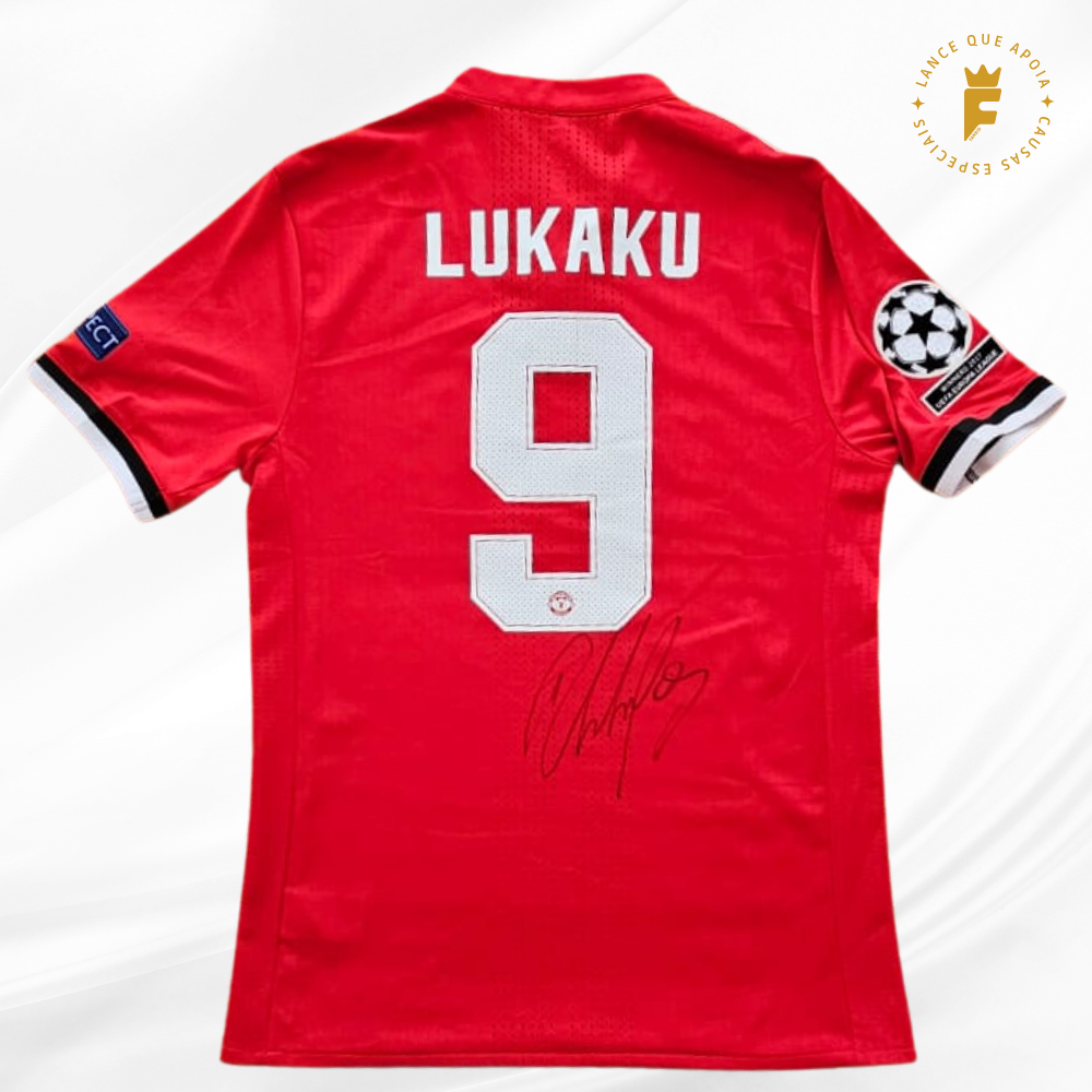 Camisa Manchester United 2017-18 Champions League, vers jogo, autografada Lukaku