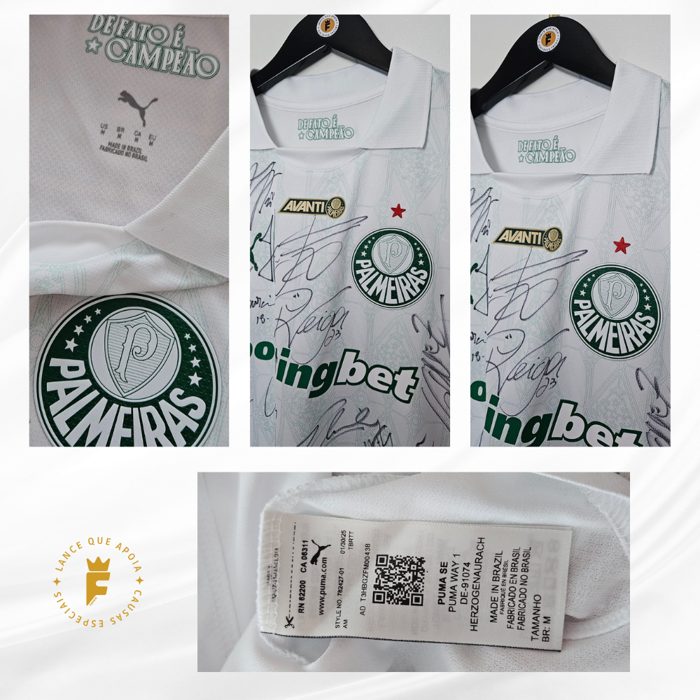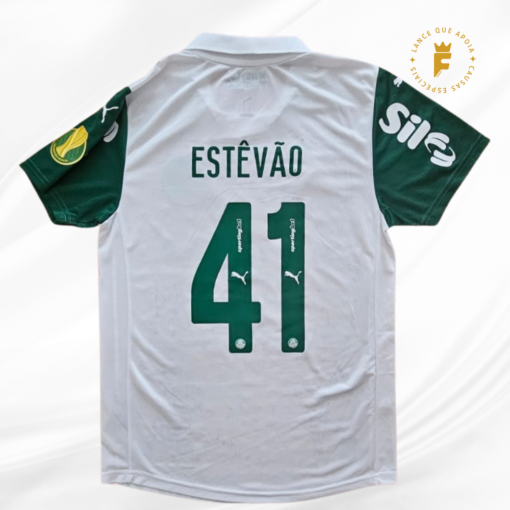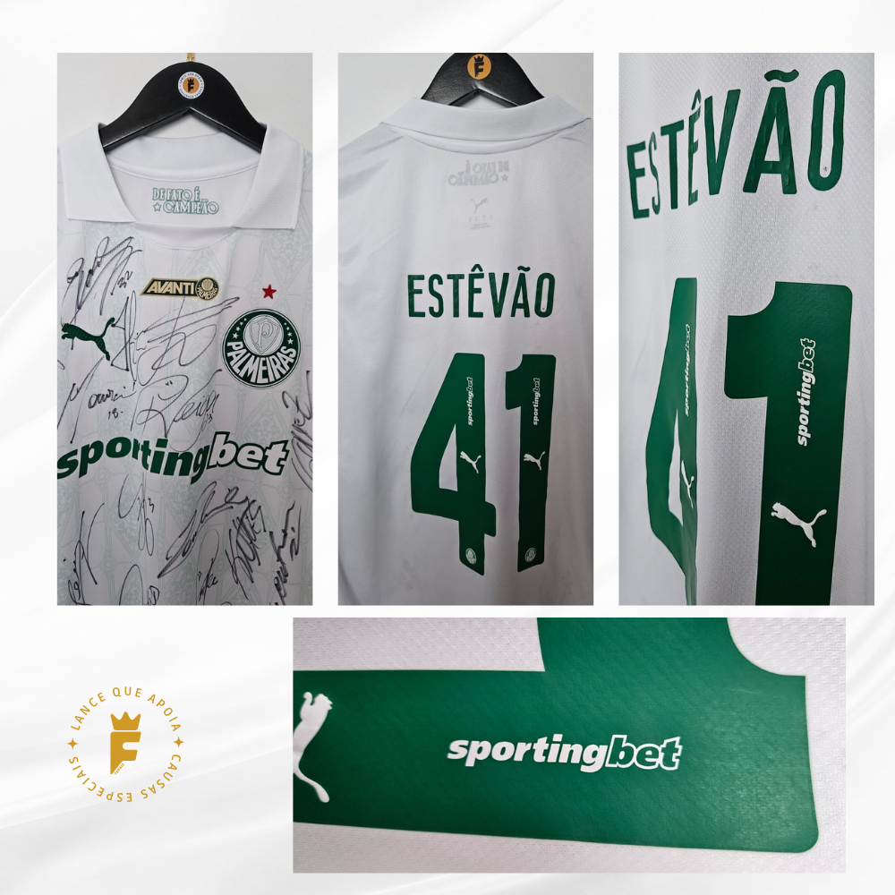 Camisa Palmeiras 2025, de jogo, N45 Estêvão, autografada elenco